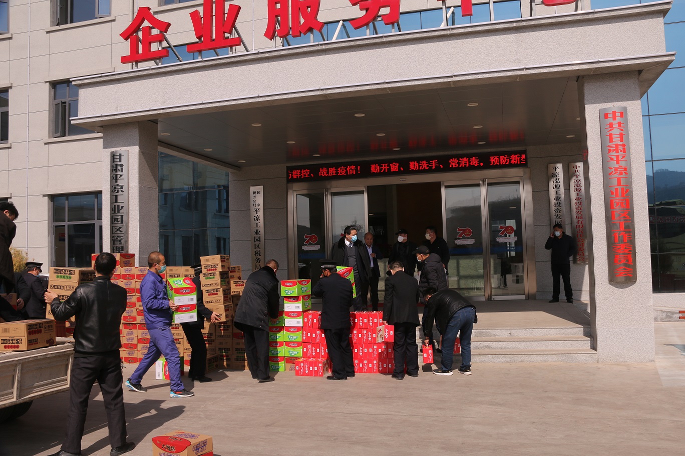 3月2日,宏達(dá)國(guó)盛集團(tuán)慰問(wèn)戰(zhàn)斗在抗疫一線(xiàn)的工作人員,并向平?jīng)龉I(yè)園區(qū)送去了200瓶84消毒液、200箱方便面、200箱八寶粥、200盒泓怡堂·遠(yuǎn)紅外磁療貼等抗疫物資和生活用品。集團(tuán)董事局主席吳宏國(guó),集團(tuán)執(zhí)行總裁蘇翔等領(lǐng)導(dǎo)出席慰問(wèn)儀式。